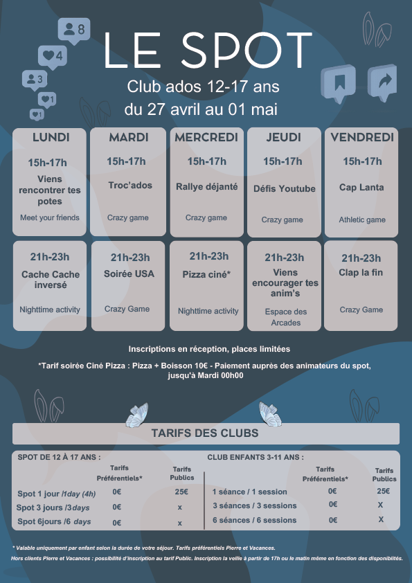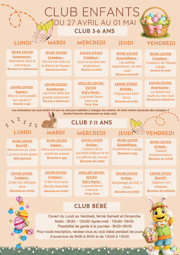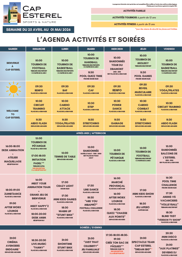 Voici le dernier programme 2026 des vacances de Pâques , animations gratuites pour les propriétaires et les locataires pour la semaine du 25 avril au 1 mai, ainsi que les animations payantes proposées par les partenaires de CAP ESTEREL.