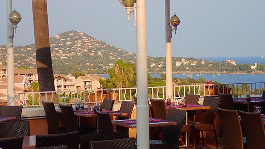 Restaurant de l’Hôtel du Village avec une terrasse qui domine la Baie d’Agay, offrant une vue mer et proposant une cuisine provençale raffinée, ouvert toute l’année. Dîner à la carte, menu enfants, buffet petit déjeuner et bar.